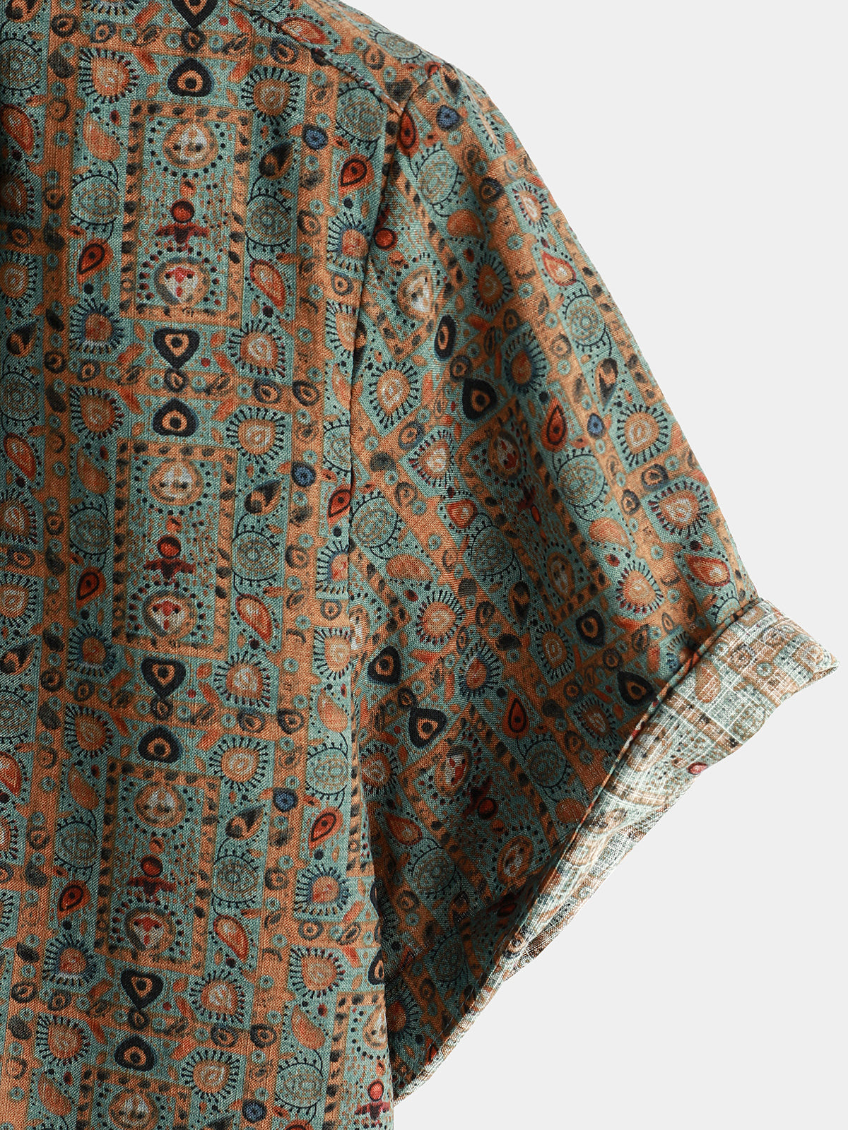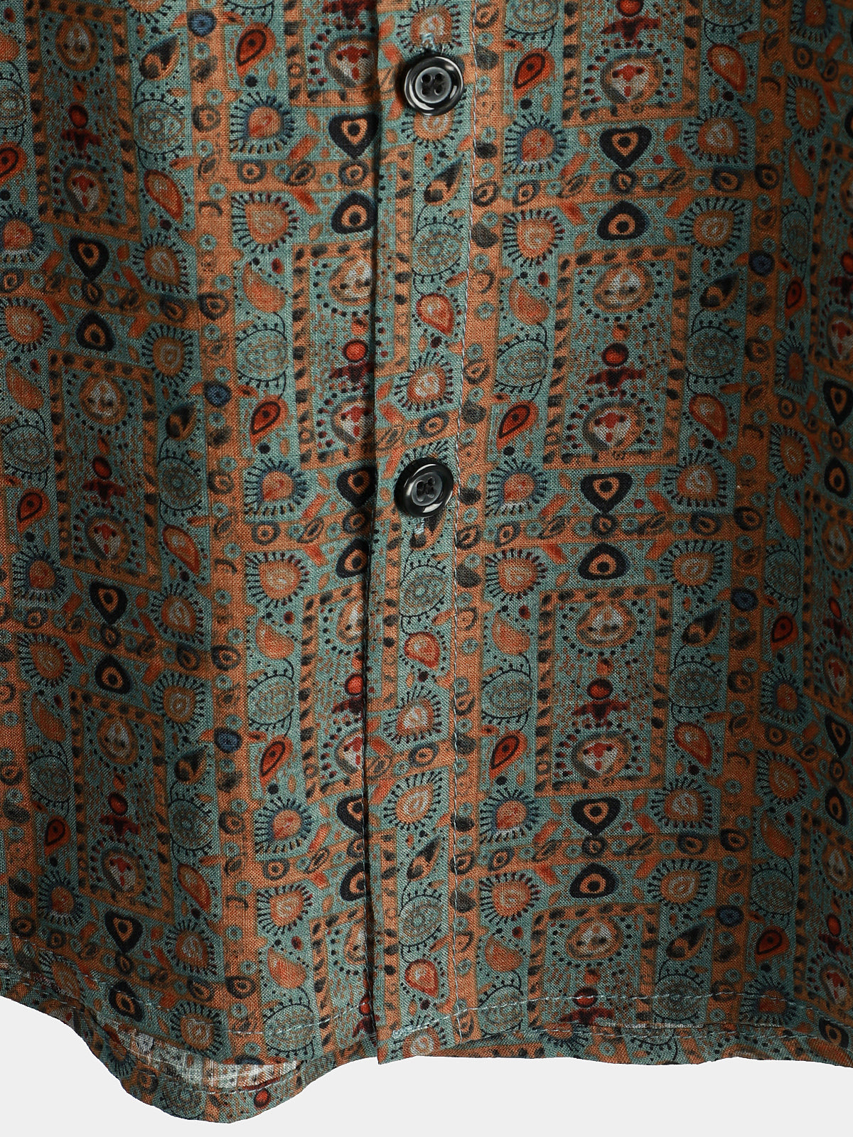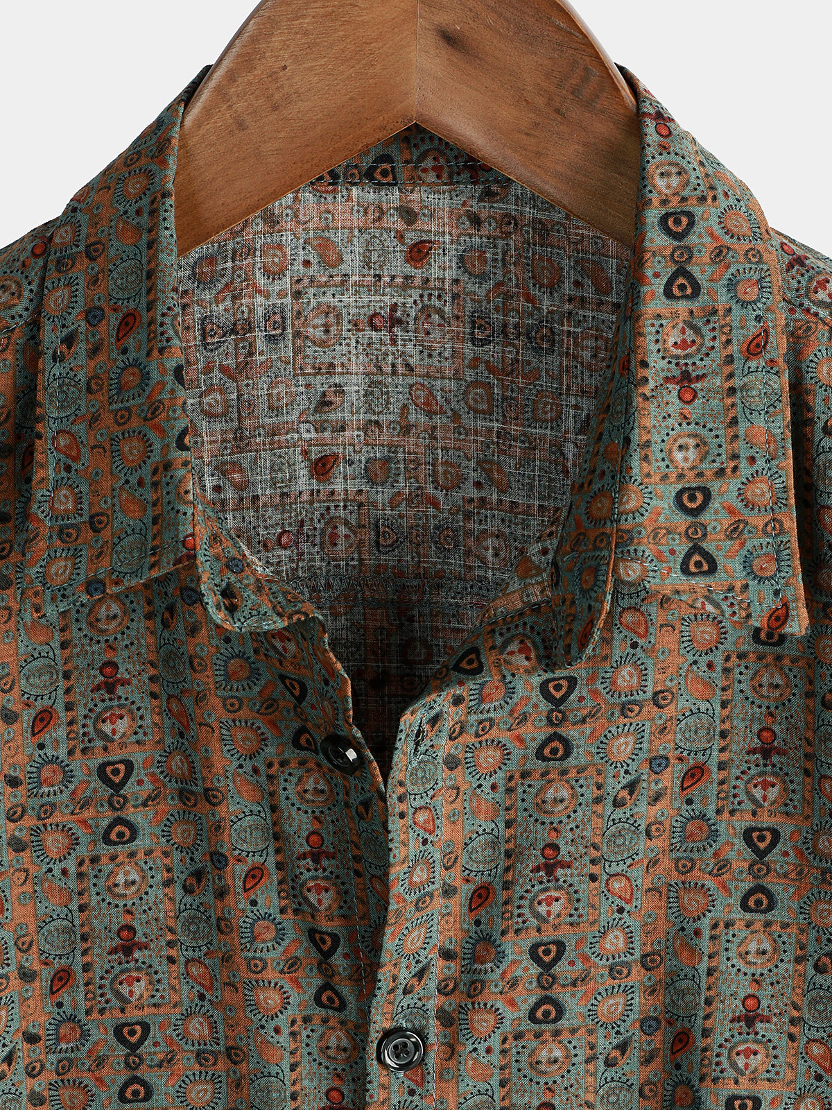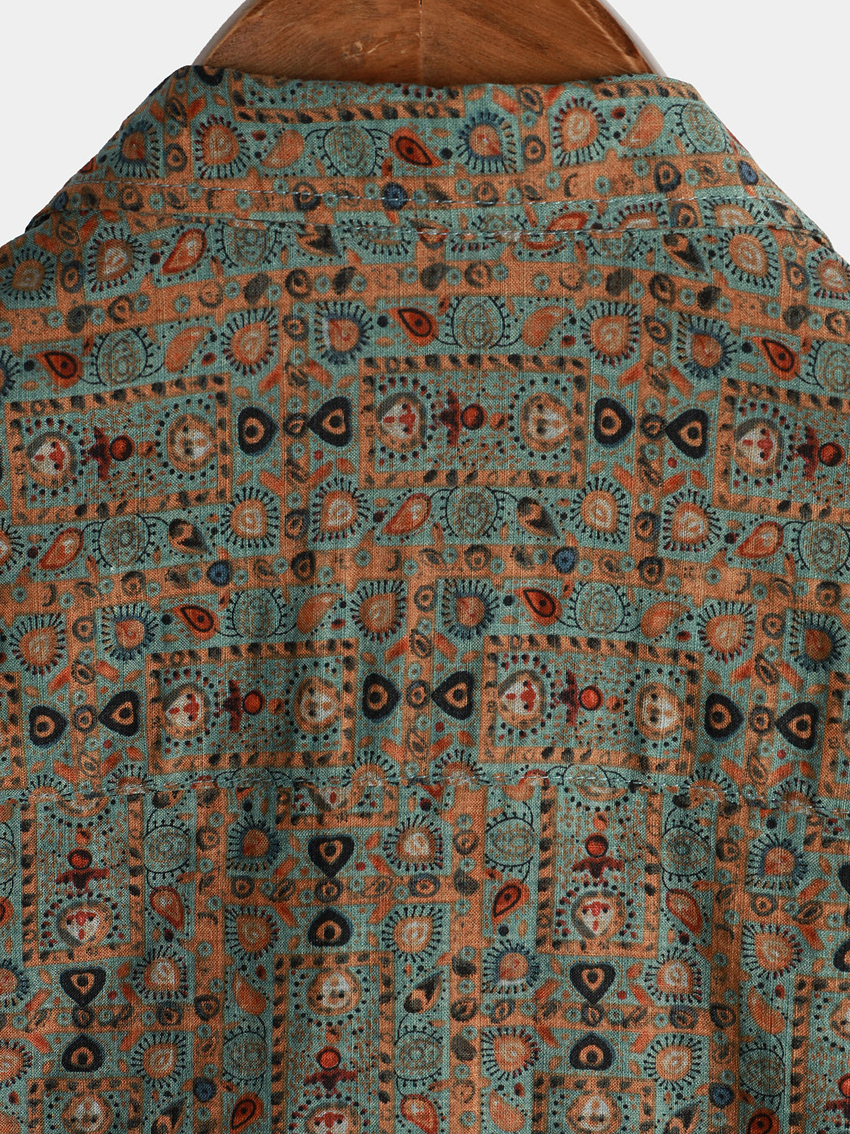 Men's Vintage Paisley Print 70s Button Up Green Boho Retro Tribal Short Sleeve Shirt