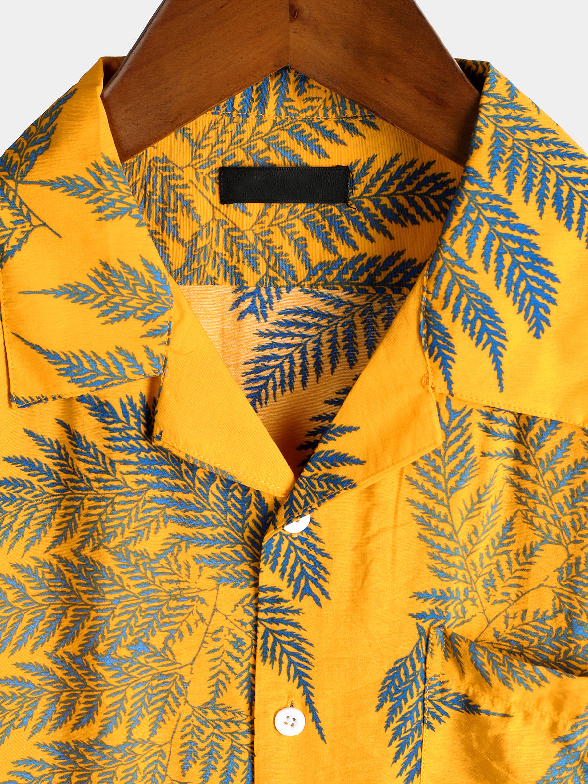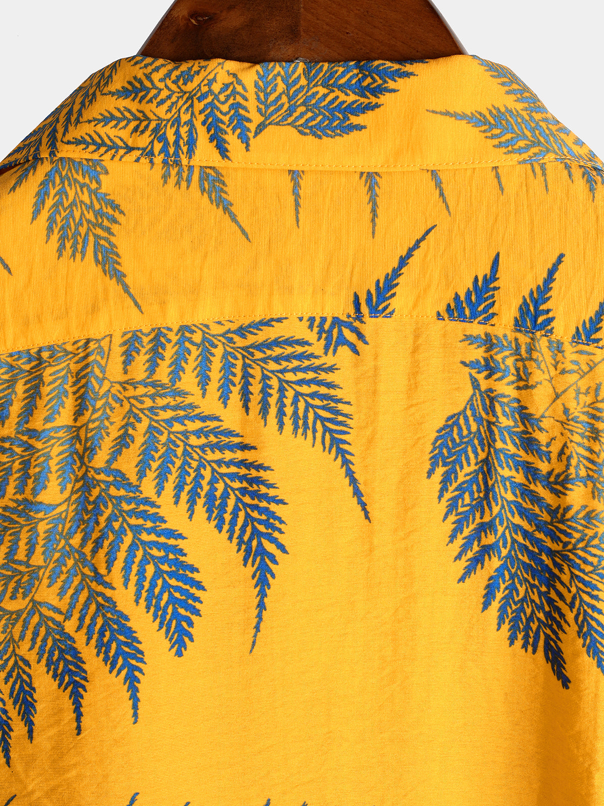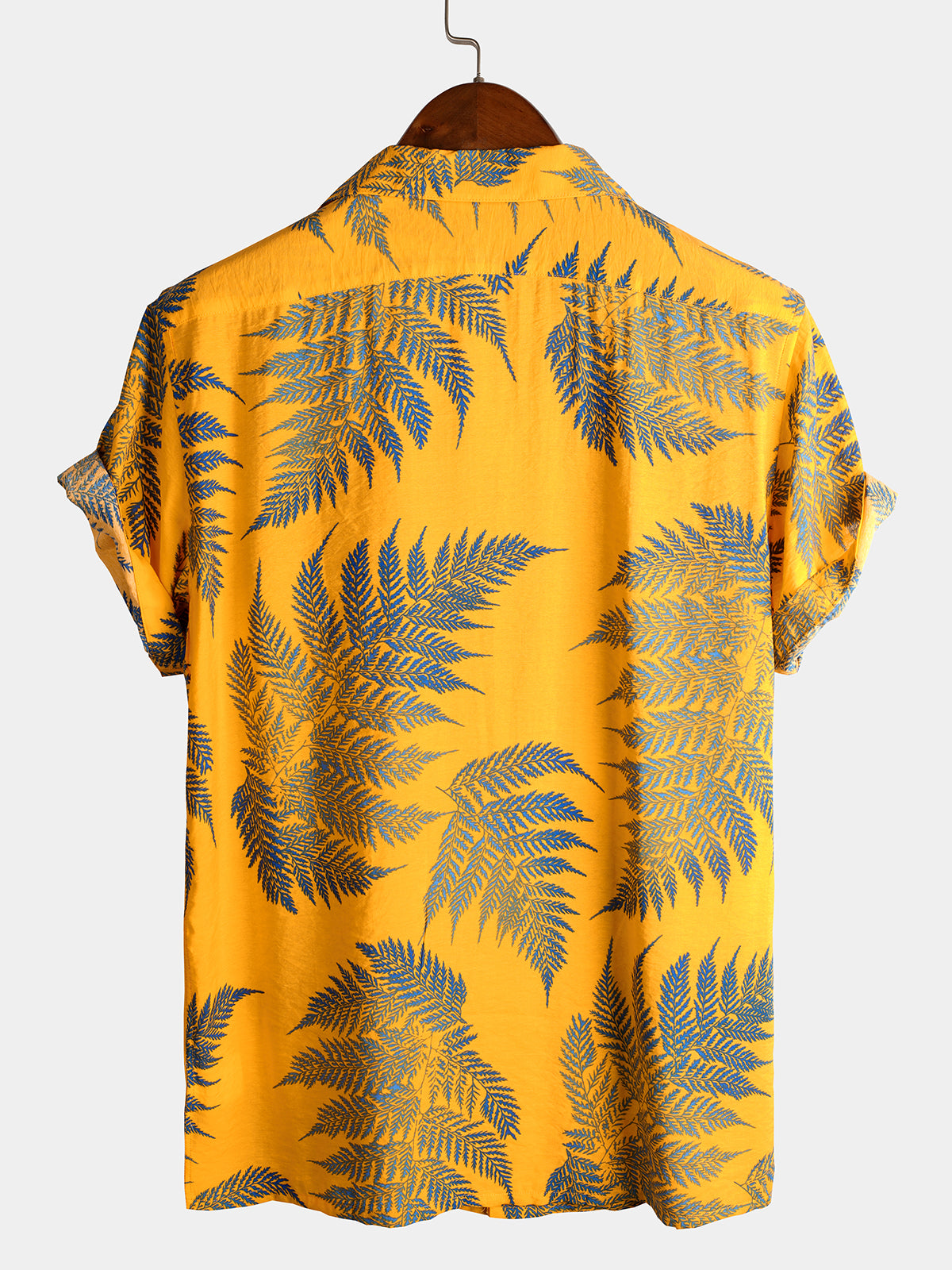 Men's Yellow Hawaiian Tropical Leaves Print Pocket Short Sleeve Shirt